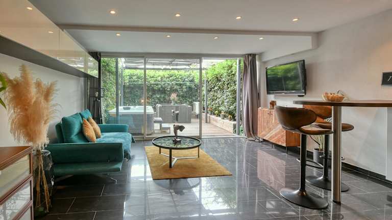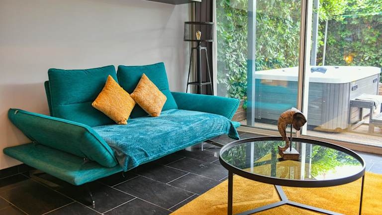 Die Ferienwohnung bietet ein Schlafzimmer, ein Wohnzimmer sowie eine voll ausgestattete Küche mit Kühlschrank und Kaffeemaschine. Zur Ausstattung gehört ein Badezimmer mit Dusche und Whirlpool. Handtücher und Bettwäsche werden bereitgestellt.