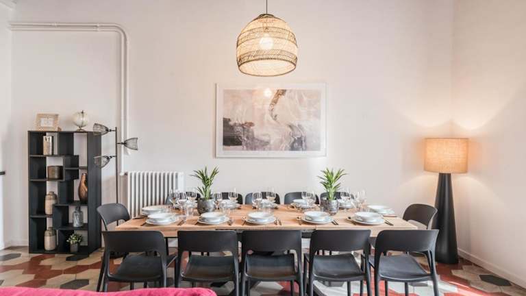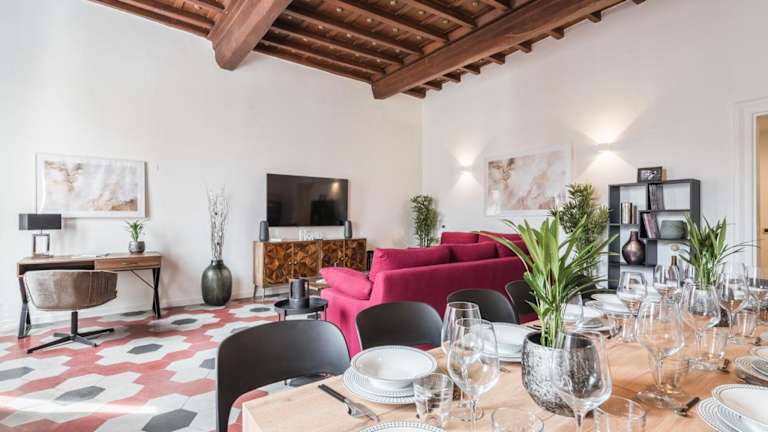 Die Ferienwohnung besteht aus 6 Schlafzimmern, einem Wohnzimmer und einer voll ausgestatteten Küche mit Kühlschrank und Kaffeemaschine. Es sind 4 Badezimmer mit Bidet und Dusche vorhanden. Handtücher und Bettwäsche werden bereitgestellt.