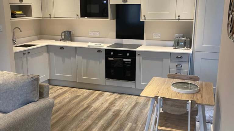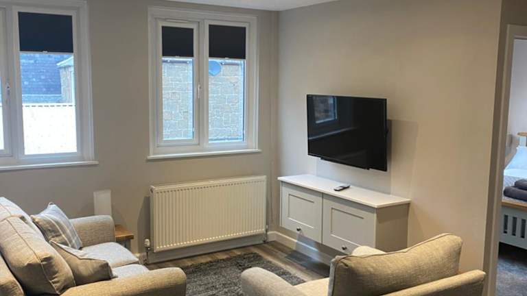 Das Apartment umfasst ein Schlafzimmer, eine voll ausgestattete Küche mit Kühlschrank und Geschirrspüler, einen Flachbild-TV, einen Sitzbereich sowie ein Badezimmer mit Dusche. Handtücher und Bettwäsche werden bereitgestellt.
