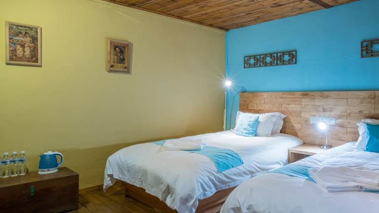 Die Zimmer im Hotel The Giggling Tree sind geräumig und komfortabel eingerichtet. Jedes Zimmer verfügt über ein eigenes Badezimmer mit westlichem WC und eine Klimaanlage. Die Zimmer sind mit traditionellen Holzschnitzereien, Bambusmöbeln und alten chinesischen Anzeigen dekoriert, was ihnen einen charmanten und authentischen Charme verleiht. Von der Terrasse aus können Sie die atemberaubende Aussicht auf das Yulong-Tal, die Berge und die Reisfelder genießen.