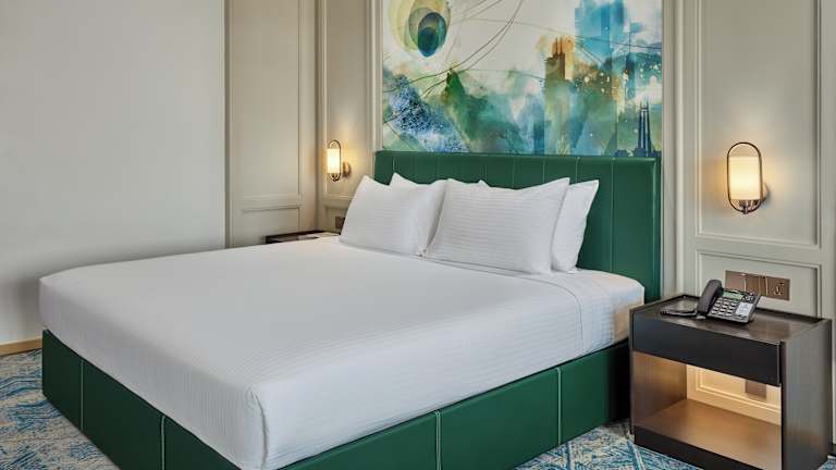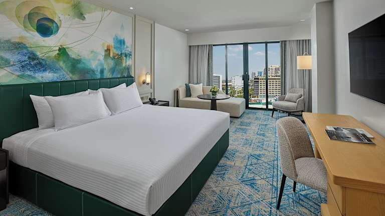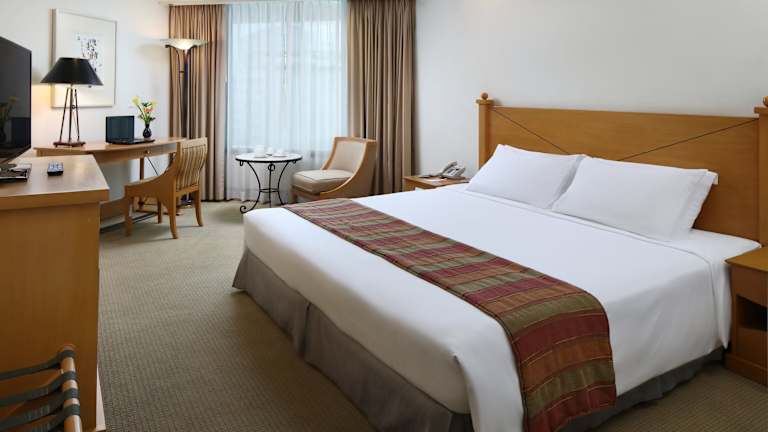 Die Zimmer sind mit einer Klimaanlage, einem Safe, einer Minibar, einem Minikühlschrank sowie einer Tee- und Kaffeemaschine ausgestattet. Zu den Annehmlichkeiten gehören auch ein Bügelset, eine Hosenpresse, ein Telefon mit Direktwahl, ein TV-Gerät mit Satelliten- und Kabelfernsehen sowie kostenfreies WLAN. Die Badezimmer sind mit Dusche und Badewanne, Haartrockner, Bademänteln und Telefon ausgestattet. Familien- sowie rollstuhlgerechte Zimmer sind ebenfalls verfügbar.