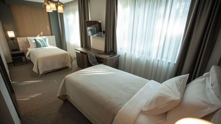 Die Zimmer im Hotel Hunter's Lodge Kamnik sind komfortabel eingerichtet und verfügen über Annehmlichkeiten wie Klimaanlage, Safe, Minibar und Schreibtisch. Die Gäste können sich auch auf kostenloses WLAN und einen Fernseher freuen. Im Badezimmer stehen eine Dusche und ein Haartrockner zur Verfügung.