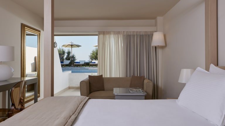 Das The Island Hotel verfügt über 298 Zimmer, die den Gästen einen Blick auf das Meer eröffnen. Mit vibrierenden Farben und einem minimalistischen Design werden die Sinne angesprochen und auf Entspannung eingestellt. Die Zimmerkategorien bieten unterschiedliche Formen des Komforts, der bis hin zu einem privaten Pool reicht. In den vier unterschiedlichen Suitenarten genießt man Luxus pur.