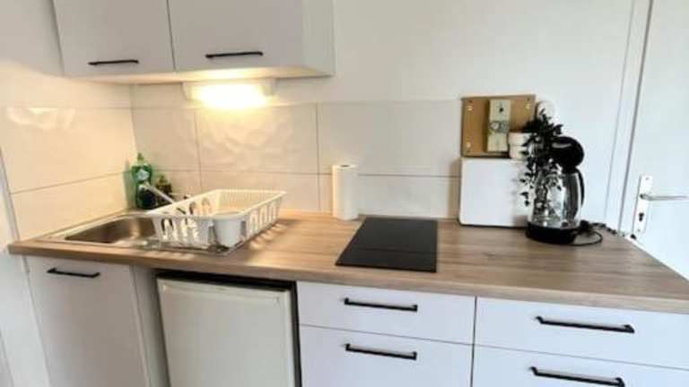 Die Ferienwohnung verfügt über eine gut ausgestattete Küche, die mit einem Kühlschrank, einer Herdplatte und einer Kaffeemaschine ausgestattet ist. Handtücher und Bettwäsche werden bereitgestellt.