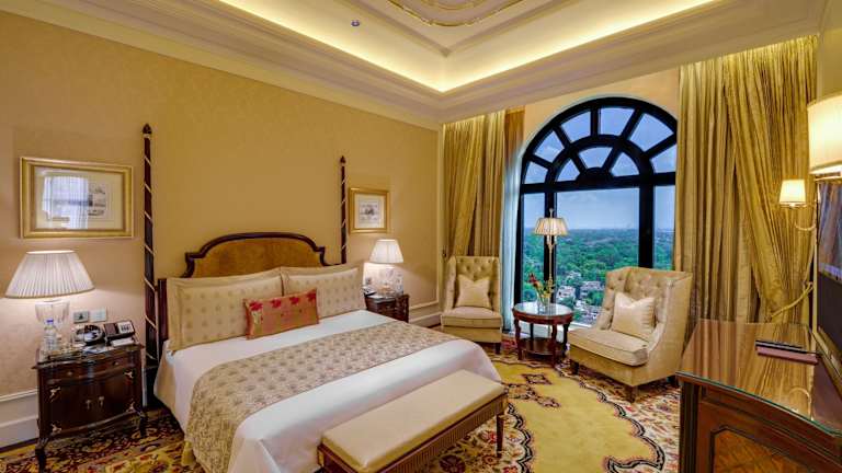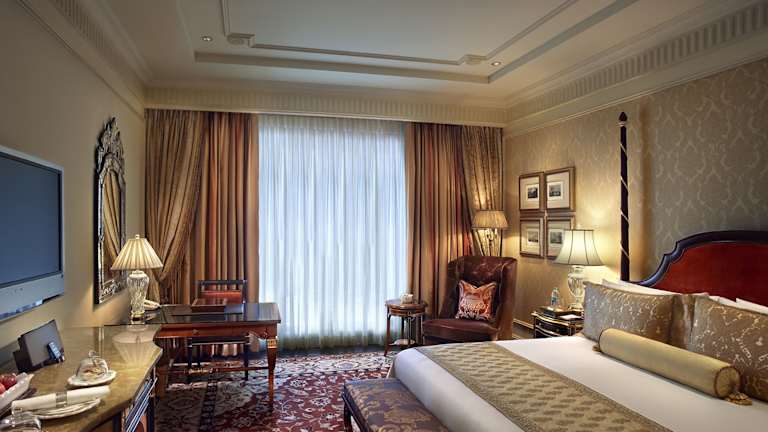 Die elegant eingerichteten Zimmer im The Leela Palace New Delhi bieten einen luxuriösen Rückzugsort für Gäste. Die Zimmer sind klimatisiert und verfügen über einen hochauflösenden Flachbild-TV mit DVD-Player, bodentiefe Fenster und edle Holzmöbel. Das Badezimmer ist mit einem weiteren Flachbild-TV ausgestattet, der als Spiegel dient, wenn er ausgeschaltet ist.