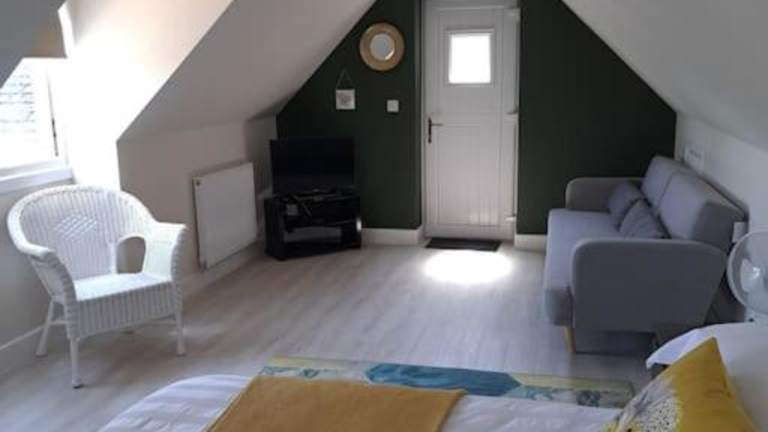 Die Ferienwohnung verfügt über ein Schlafzimmer, ein Wohnzimmer und ein Badezimmer. Zur Ausstattung gehören ein Haartrockner, eine Dusche sowie Handtücher und Bettwäsche.