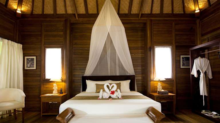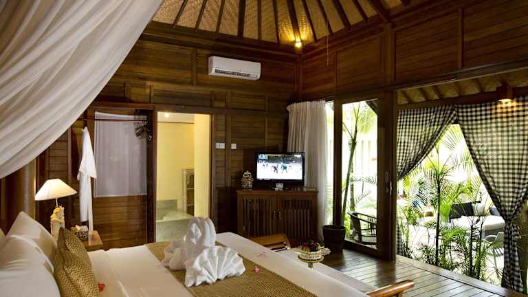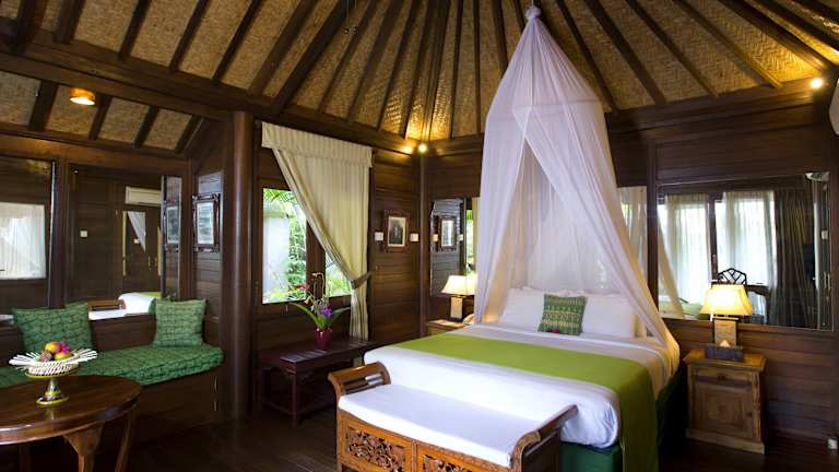 Die Zimmer sind geräumig und erstklassig ausgestattet, mit individuell regelbarer Klimaanlage, luxuriösen Bädern, Minibar und Kunstwerken von lokalen Künstlern. Die Unterkünfte sind im Innenhof oder in den tropischen Gärten gelegen und bieten Gartenblick.