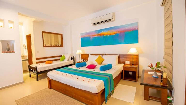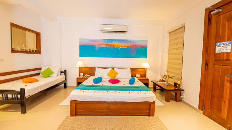 Erleben Sie einen entspannten Aufenthalt im Residence Hikkaduwa in Hikkaduwa. Die Unterkunft befindet sich in einer idealen Lage, nur wenige Gehminuten vom Busbahnhof entfernt und bietet kostenfreies WLAN und Privatparkplätze. Die klimatisierten Zimmer sind komfortabel eingerichtet und verfügen über einen Flachbild-Sat-TV und einen Blu-ray-Player. Entspannen Sie nach einem ereignisreichen Tag in Ihrem Zimmer oder erkunden Sie die Umgebung mit dem Fahrrad oder einem Mietwagen. Das freundliche Personal steht Ihnen gerne zur Verfügung und kann bei Bedarf Transfers oder Yoga- und Meditationskurse organisieren.
