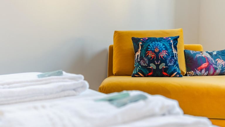 Die Ferienwohnung umfasst zwei Schlafzimmer, ein Wohnzimmer und eine voll ausgestattete Küche mit Kühlschrank und Wasserkocher. Ein Badezimmer ist ebenfalls vorhanden, das mit einem Bidet und einer Dusche ausgestattet ist. Handtücher und Bettwäsche werden bereitgestellt.