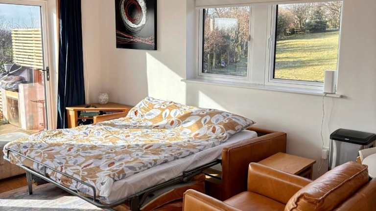 Das Ferienhaus hat ein Schlafzimmer und ist ausgestattet mit Kabel-Flachbild-TV, einem Essbereich, einer Küchenzeile mit Kühlschrank und einem Wohnzimmer. Handtücher und Bettwäsche werden bereitgestellt.