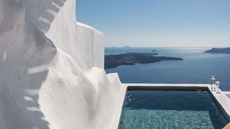 Das Hotel befindet sich am höchsten Punkt der Caldera zwischen Fira und Imerovigli, in der Nähe des byzantinischen Klosters Agios Nikolaos. Von hier aus haben Sie einen spektakulären Blick auf die umliegende Landschaft und sind nur wenige Kilometer von Sehenswürdigkeiten wie Skaros und dem Hafen Athinios entfernt. Der Flughafen Santorin ist ebenfalls leicht erreichbar.