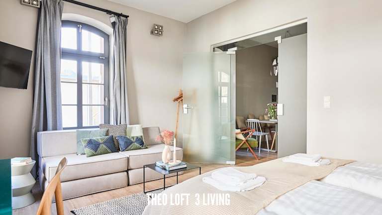 Die Wohneinheiten im TheoLoft umfassen einen Sitzbereich mit einem Schlafsofa und einen Essbereich. Außerdem steht eine voll ausgestattete Küche mit Kühlschrank, Geschirrspüler, Ofen und Herdplatte zur Verfügung. Jedes Zimmer verfügt über ein eigenes Badezimmer mit Dusche und Haartrockner.