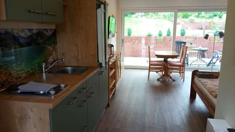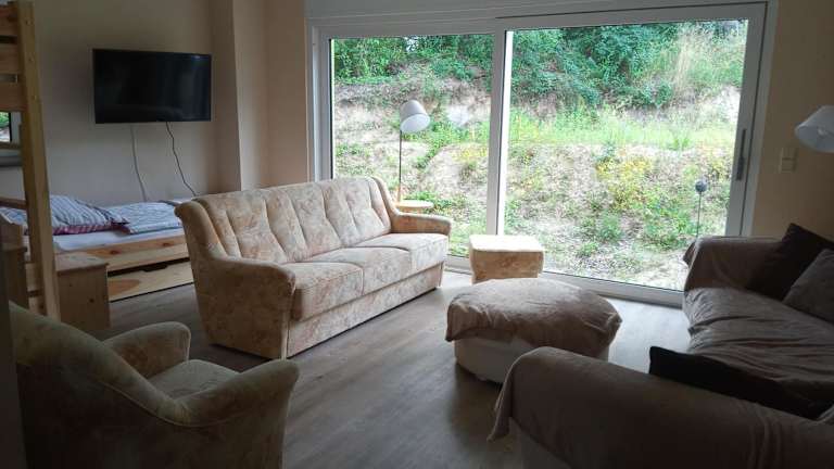 Die Therapiescheune Egsdorf - Monteurwohnungen bietet ihren Gästen eine Terrasse und einen schönen Ausblick auf den Garten. Die Unterkunft ist besonders auf die Bedürfnisse von Monteuren ausgelegt.