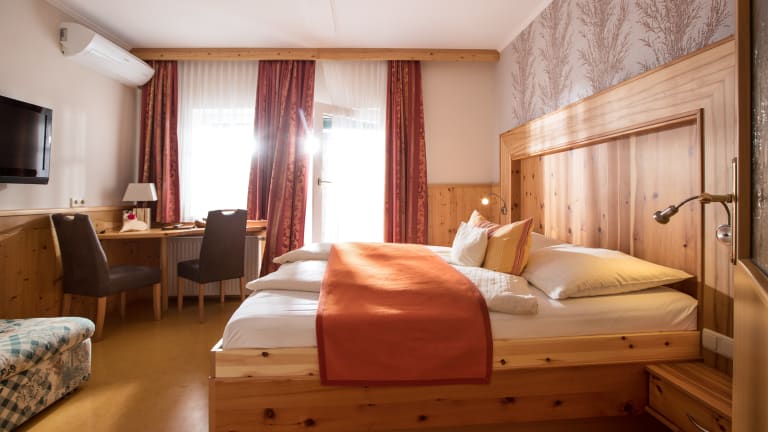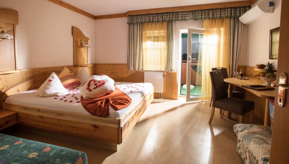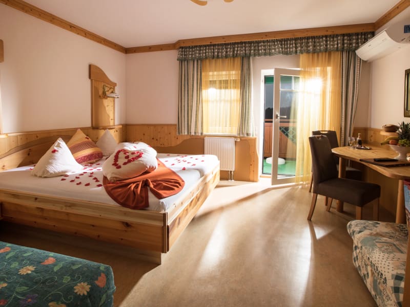 Alle unsere Zimmer sind Bio-Gesundheitszimmer mit Zirben-Vollholzbetten, ausschließlich Nichtraucher-Zimmer. Nachweislich wird die Schlaf- und Erholungsqualität verbessert. Dem Herzen werden 3500 Schläge pro Tag (ca. 1 Stunde Herzarbeit) erspart. Der Schlaf ist vor allem im ersten Schlafzyklus tiefer und die vegetative Erholung des Körpers ist um vieles besser! • Anti-Allergie-Ausstattung (deshalb keine Haustiere!) • Salzkristall-Leuchten für Wohlfühl-Ambiente • Entspannungs-Kräuterkissen • Belebtes Grander-Wasser im ganzen Haus • Balkon oder Sonnenterrasse • Telefon, Safe, Sat- und Sky-TV, Radio • Gratis Internetanschluss in allen Zimmern • Die meisten Zimmer und die Ferienwohnungen sind voll klimatisiert • Wärmeschutz-Rollos mit Insektengitter • Am Zimmer erwartet Sie eine kleine Kostbarkeit aus der Region