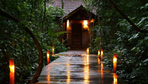 Im Tierra Guaraní Lodge können Sie sich morgens am reichhaltigen Frühstücksbuffet mit tropischen Früchten verwöhnen lassen. Das Hotel verfügt über ein Restaurant, in dem Sie weitere kulinarische Köstlichkeiten genießen können.