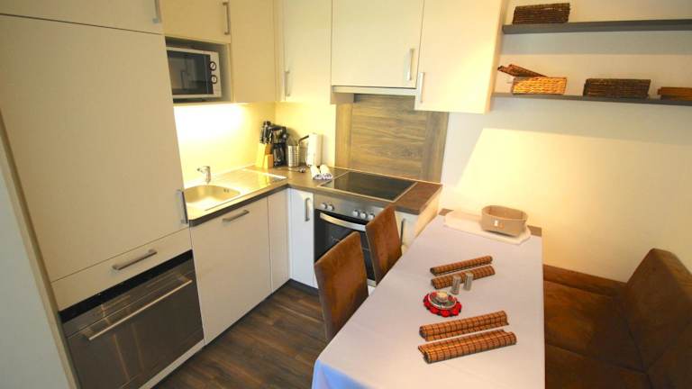 Das Apartment im Hotel Tim verfügt über eine Terrasse mit herrlichem Bergblick. Es bietet ein Schlafzimmer, ein Wohnzimmer mit Flachbild-TV, eine voll ausgestattete Küche mit Kühlschrank und Geschirrspüler sowie ein Badezimmer mit Dusche. Handtücher und Bettwäsche werden gestellt.