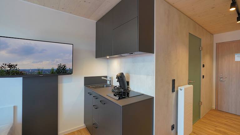 In den Wohneinheiten ist eine voll ausgestattete Küchenzeile vorhanden, die einen Kühlschrank, eine Herdplatte sowie eine Kaffeemaschine beinhaltet.