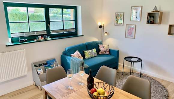 Die Ferienwohnung verfügt über 1 Schlafzimmer, ein Wohnzimmer und eine voll ausgestattete Küche mit Kühlschrank und Kaffeemaschine. Ein Badezimmer mit Dusche und Haartrockner ist ebenfalls vorhanden. Handtücher und Bettwäsche werden bereitgestellt.