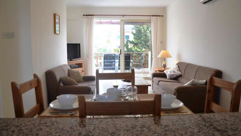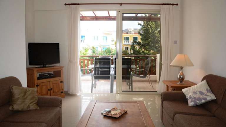 Das klimatisierte Apartment Saskia bietet zwei separate Schlafzimmer, ein Wohnzimmer mit Sofas und TV, eine voll ausgestattete Küche mit Esstisch und einen Balkon mit Blick auf das Dorf. Zur Ausstattung gehören auch eine Waschmaschine und ein Bügeleisen. Die Unterkunft bietet alles, was Sie für einen komfortablen Aufenthalt benötigen.