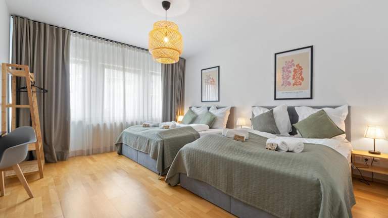Die Ferienwohnung umfasst 3 Schlafzimmer sowie ein Wohnzimmer und bietet insgesamt Platz für eine größere Gruppe. Sie verfügt über einen Flachbild-TV, eine gut ausgestattete Küche mit Kühlschrank und Geschirrspüler sowie über 2 Badezimmer mit Dusche. Ein Balkon und eine Terrasse mit Gartenblick sind ebenfalls vorhanden. Handtücher und Bettwäsche werden bereitgestellt.