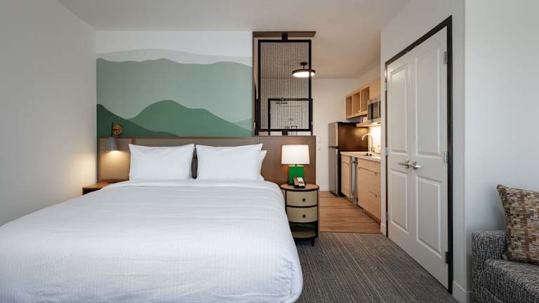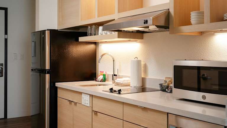 Einige Zimmer sind mit einer voll ausgestatteten Küche ausgestattet, die einen Kühlschrank, einen Geschirrspüler und einen Ofen umfasst.