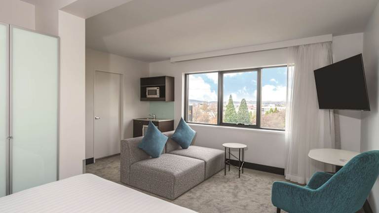 Das Hotel verfügt über 131 Zimmer, die alle komfortabel und gemütlich eingerichtet sind. Jedes Zimmer ist mit einem 32-Zoll-LCD-TV, einer Klimaanlage, einem Kühlschrank und einer Tee-/Kaffeemaschine ausgestattet. Die meisten Zimmer verfügen über eine Kitchenette und einen geräumigen Sitzbereich. Ein Reinigungsservice steht Ihnen täglich zur Verfügung.