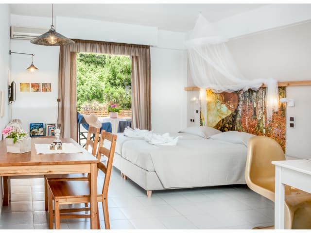 Bathroom Toilet paper Linen Towels Bath or Shower Slippers Private bathroom Toilet Free toiletries Hairdryer Shower Bedroom Wardrobe or closet Extra Long Beds (> 2 metres) Outdoors Sit back and relax Outdoor furniture Outdoor dining area Outdoor furniture Sun terrace Balcony Terrace Garden Kitchen Freedom to eat when you want Dining table Stovetop Kitchenware Electric kettle Refrigerator Room Amenities Extra comfort Sofa bed Mosquito net Tile/Marble floor Safety Deposit Box Outdoor & View Enjoy the view Pool view Garden view View Pets Pets are not allowed. Activities Themed dinner nights Additional charge Beach Living Area Space for everyone to be together Sofa Seating Area Media & Technology Fun for everyone under one roof Flat-screen TV TV Food & Drink On-site coffee house Wine/champagne Additional charge Snack bar Bar Great coffee! Internet Free! WiFi is available in all areas and is free of charge. Accessibility Entire unit located on ground floor Parking Free! Free private parking is possible on site (reservation is not needed). Building characteristics Semi-detached Pool and wellness Swimming pool Sun loungers or beach chairs Pool bar Pool/beach towels Swimming pool toys Outdoor pool (seasonal) Outdoor pool Transport Shuttle service Airport drop off Additional charge Airport pick up Additional charge Airport shuttle (additional charge) Shuttle service (additional charge) Reception services Tickets to attractions or shows Additional charge Tour desk Entertainment and family services Strollers Cleaning services Daily housekeeping Shops Shops (on site) Gift shop Miscellaneous Air conditioning Heating Bridal suite Family rooms Non-smoking rooms Languages spoken Greek English Italian