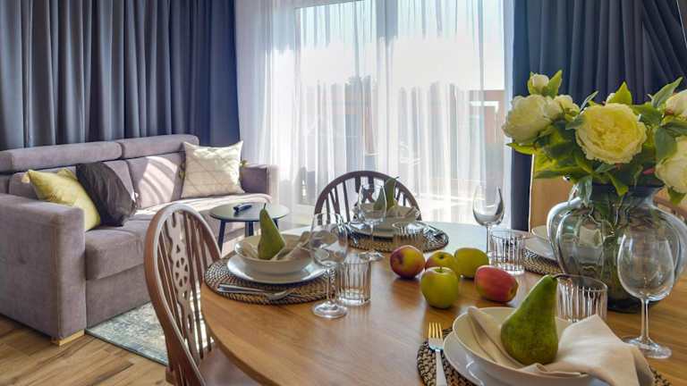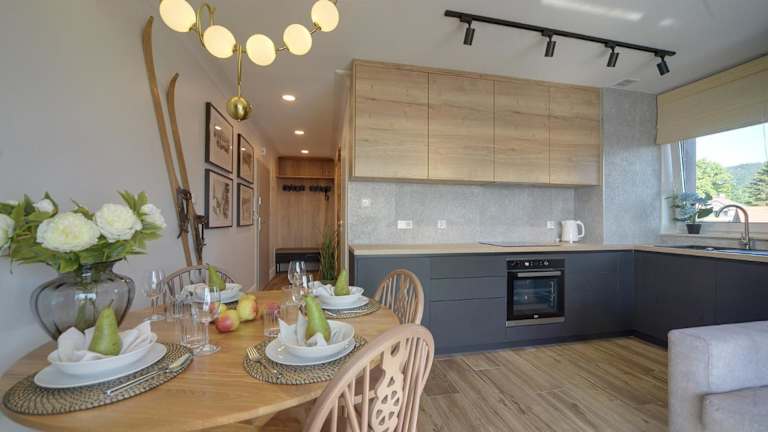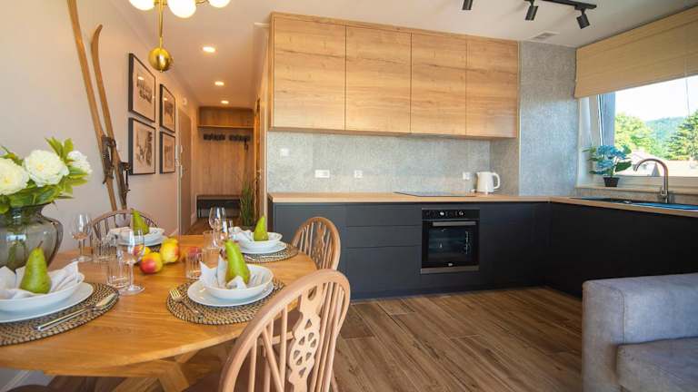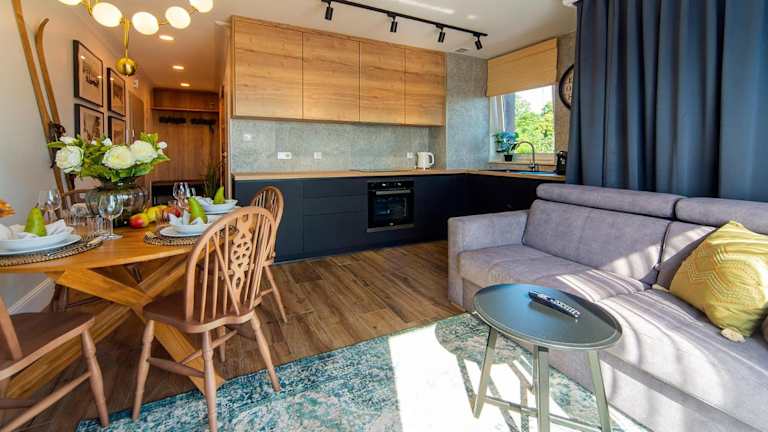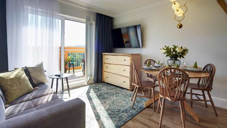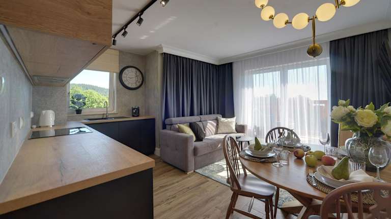 Trevilles Apartamenty - Shiny Rock bietet eine Ferienwohnung mit einem Balkon und Blick auf die Berge. Gäste können von einer Sonnenterrasse profitieren. Die Unterkunft ist familienfreundlich, da Kinder willkommen sind, und es gelten spezielle Standards zum Schutz von Minderjährigen. Haustiere sind ebenfalls gestattet, wobei mögliche Gebühren anfallen können. Die Unterkunft legt großen Wert auf Sicherheits- und Hygienemaßnahmen.