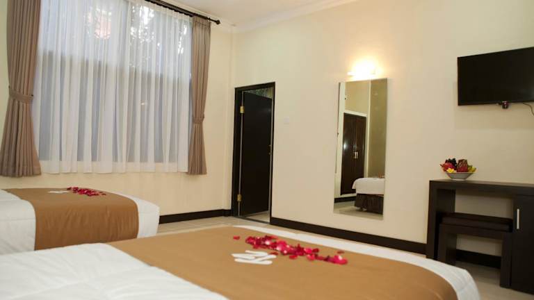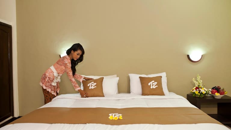 Die Zimmer im Troppo Zone Puri Rama Resort Kuta sind im traditionellen balinesischen Stil gestaltet und bieten einen eigenen Balkon oder eine Terrasse mit Blick auf den üppigen Garten. Die Zimmer sind klimatisiert und mit einem Flachbild-TV ausgestattet. Im eigenen Bad finden Sie eine Warmwasserdusche vor. Die Zimmer sind hell und bieten viel Tageslicht, um eine angenehme Atmosphäre zu schaffen.