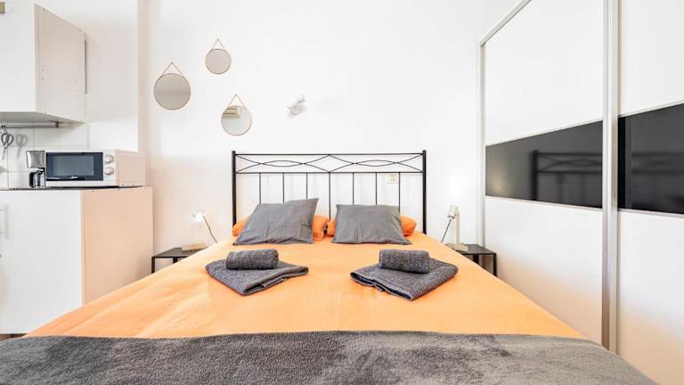 Die Unterkunft bietet eine Ferienwohnung mit Klimaanlage, die über ein Schlafzimmer, einen Satelliten Flachbild-TV, einen Essbereich sowie eine Küchenzeile mit Kühlschrank und Mikrowelle verfügt.