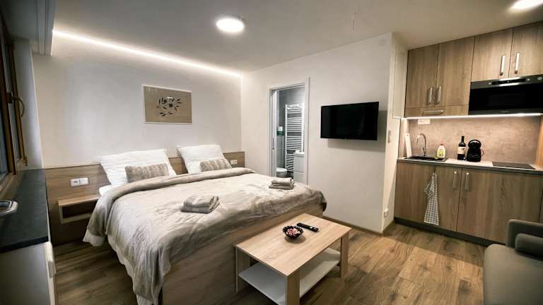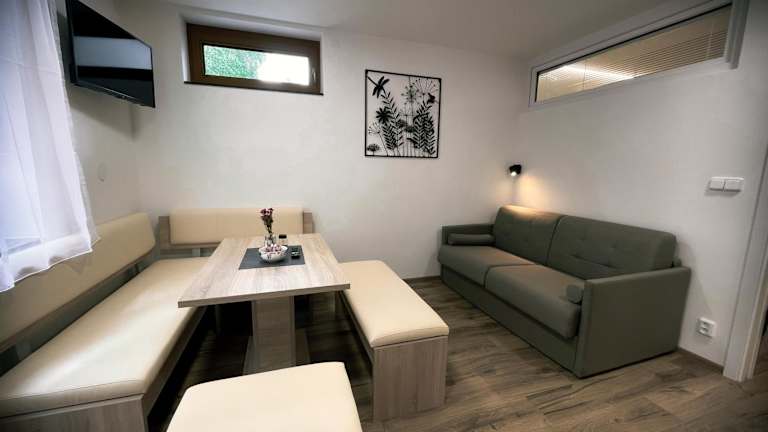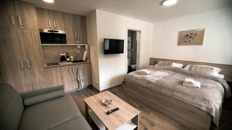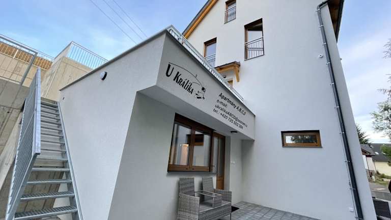 Die Apartments im U Králíka, přízemní bezbarierové apartmány A, B,C,D sind geräumig und komfortabel. Sie verfügen über eine Terrasse, auf der Sie die frische Luft und die Aussicht genießen können. Im Inneren finden Sie einen gemütlichen Sitzbereich und einen Flachbild-TV für Unterhaltung. Die voll ausgestattete Küche bietet Ihnen die Möglichkeit, Ihre eigenen Mahlzeiten zuzubereiten, und das private Badezimmer ist mit einer Dusche und kostenlosen Pflegeprodukten ausgestattet. Zusätzliche Annehmlichkeiten wie ein Kochfeld, eine Kaffeemaschine und ein Wasserkocher sind ebenfalls vorhanden.