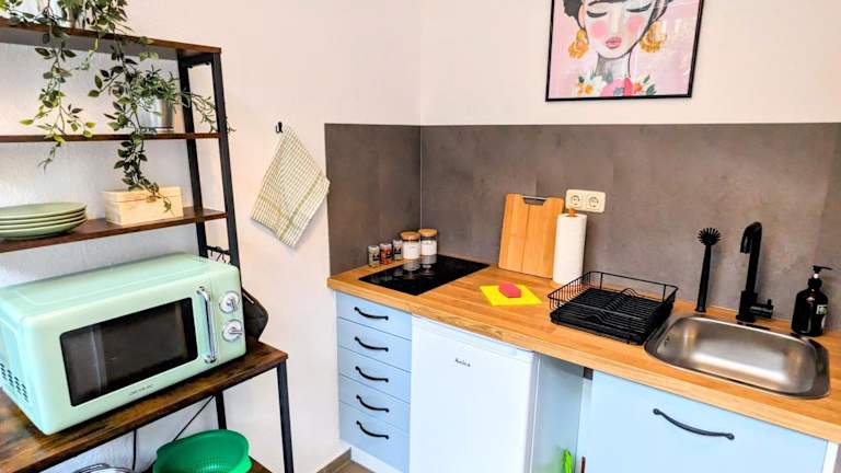 Die Küche der Unterkunft ist mit einem Kühlschrank, einer Mikrowelle, einer Herdplatte, einem Toaster, einer Kaffeemaschine und einem Wasserkocher ausgestattet. Dies bietet den Gästen die Möglichkeit zur Selbstverpflegung.