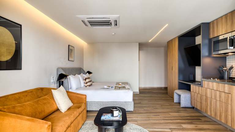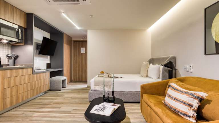 Die Zimmer sind mit einer voll ausgestatteten Küchenzeile ausgestattet, zu der ein Kühlschrank, eine Mikrowelle, eine Herdplatte und eine Kaffeemaschine gehören. Es ist ein Essbereich vorhanden.