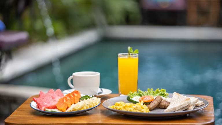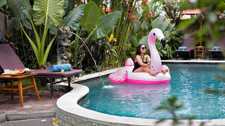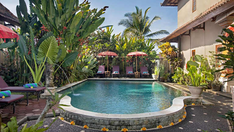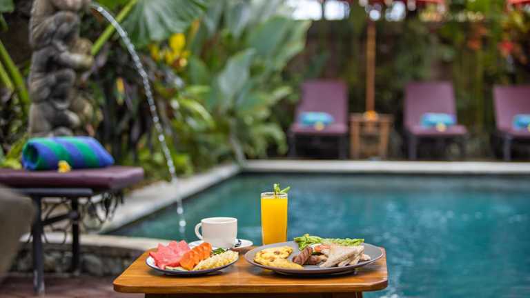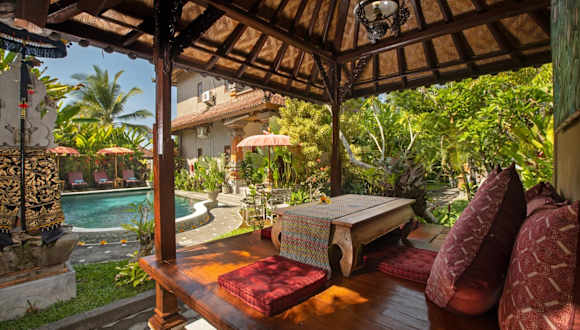 Der Außenpoolbereich des Uma Sari Cottage lädt zum Entspannen und Erfrischen ein. Für zusätzliche Entspannung können Sie auch eine Massage buchen, die gegen Gebühr angeboten wird.