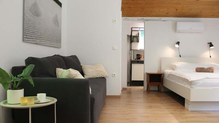 Das Ferienhaus ist klimatisiert und umfasst ein Schlafzimmer sowie ein Wohnzimmer. Die voll ausgestattete Küchenzeile ist mit einem Kühlschrank und einem Wasserkocher ausgestattet. Ein Badezimmer mit Dusche und kostenlosen Pflegeprodukten steht ebenfalls zur Verfügung. Handtücher und Bettwäsche werden bereitgestellt.