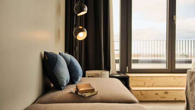 90 helle Zimmer und Suiten mit großen Fenstern, komfortabler Einrichtung – einige davon mit Terrasse