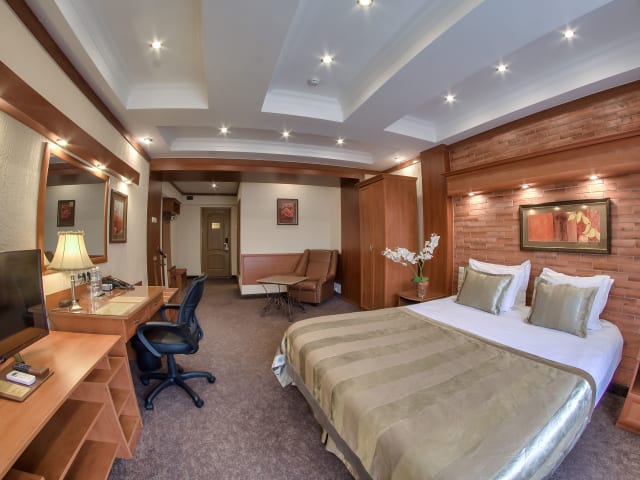 Die 100 Zimmer des Uyut Almaty Hotels sind klassisch eingerichtet und klimatisiert. Jedes Zimmer verfügt über einen Flachbild-TV, eine Minibar und ein eigenes Badezimmer mit Hausschuhen und Bademänteln. Kostenloses WLAN ist ebenfalls verfügbar.