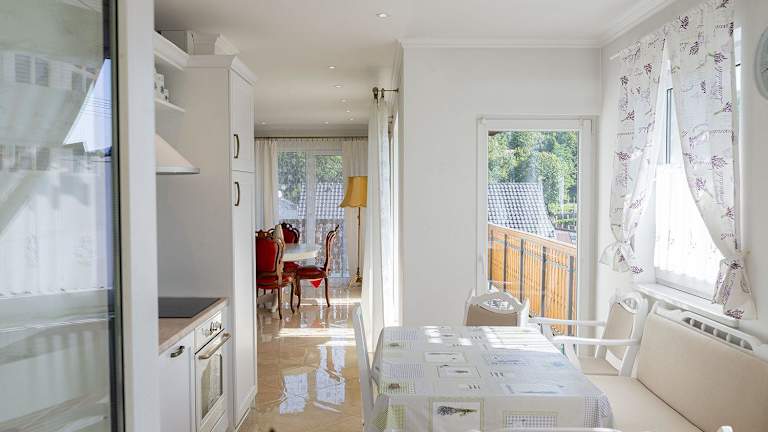 Die Ferienwohnung verfügt über 2 Schlafzimmer, ein Wohnzimmer und eine voll ausgestattete Küchenzeile mit Kühlschrank und Kaffeemaschine. Zur weiteren Ausstattung gehören ein Badezimmer mit Dusche und Haartrockner. Handtücher und Bettwäsche werden bereitgestellt.