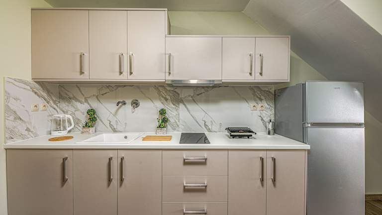 Die vollständig ausgestattete Küche in der Unterkunft bietet Kühlschrank, Geschirrspüler, Ofen, Mikrowelle, Herdplatte, Kaffeemaschine und Wasserkocher, sodass Gäste selbstständig zubereiten können. Zudem ist ein Grill vorhanden.