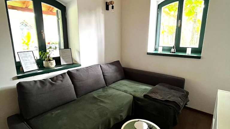 Das Ferienhaus umfasst ein Schlafzimmer, ein Wohnzimmer sowie eine voll ausgestattete Küche mit Kühlschrank und Kaffeemaschine. Zudem gibt es ein Badezimmer mit Whirlpool und Haartrockner. Handtücher und Bettwäsche sind ebenfalls verfügbar.