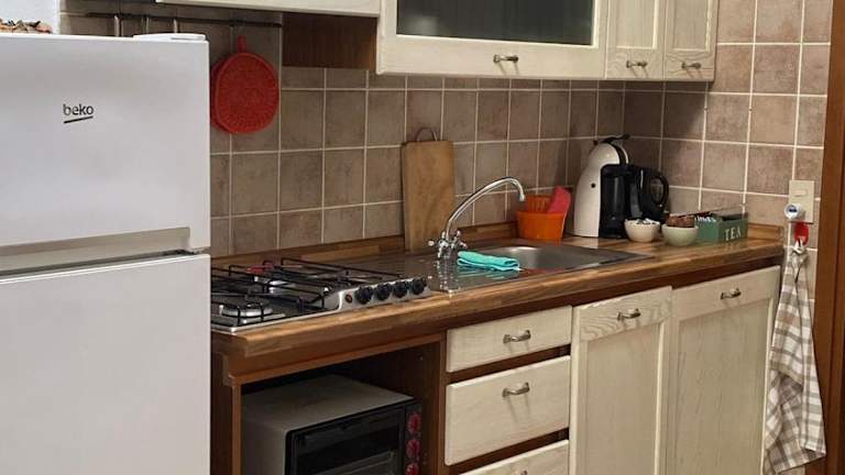 Die Ferienwohnung verfügt über eine voll ausgestattete Küche mit einem Kühlschrank und einem Wasserkocher.