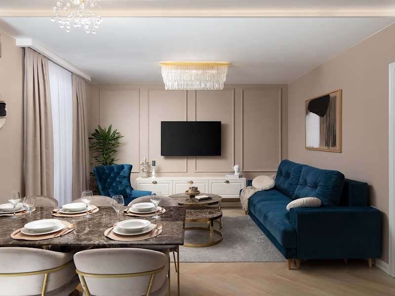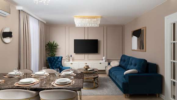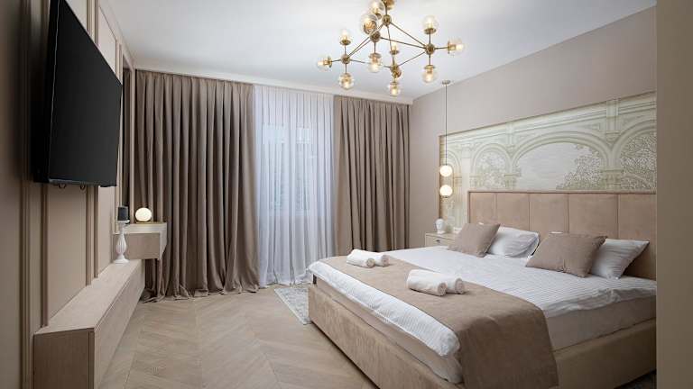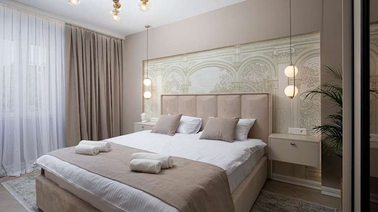 Die Ferienwohnung umfasst zwei Schlafzimmer und ein Wohnzimmer. Sie ist ausgestattet mit einem Satelliten-Flachbild-TV, einer gut ausgestatteten Küche, zwei Badezimmern mit Dusche und Whirlpool sowie einem Balkon. Handtücher und Bettwäsche werden zur Verfügung gestellt.