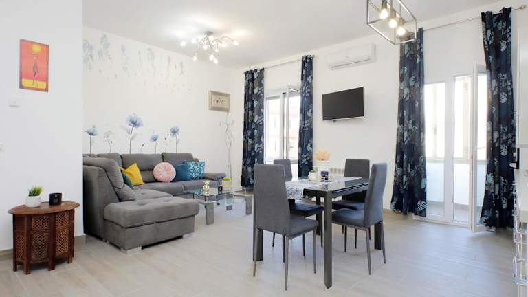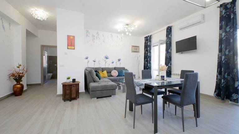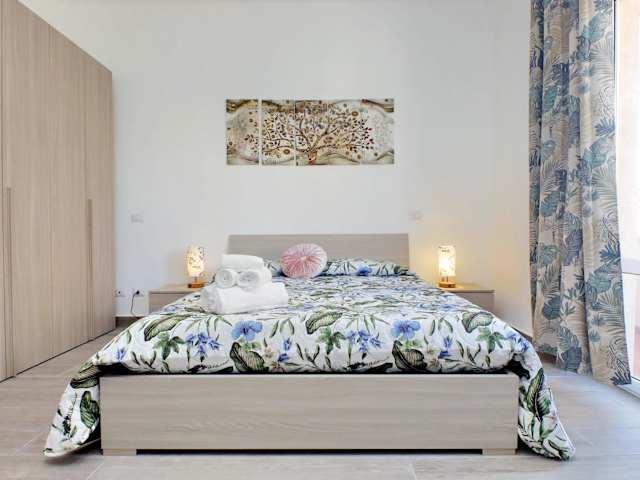 Die Ferienwohnung verfügt über zwei Schlafzimmer, ein Wohnzimmer und eine voll ausgestattete Küchenzeile mit Kühlschrank und Kaffeemaschine. In der Unterkunft gibt es ein Badezimmer mit Bidet und Dusche. Zur Ausstattung gehören Klimaanlage, kostenloses WLAN, Handtücher und Bettwäsche sowie tägliche Reinigung gegen Gebühr.