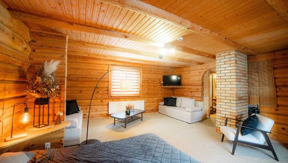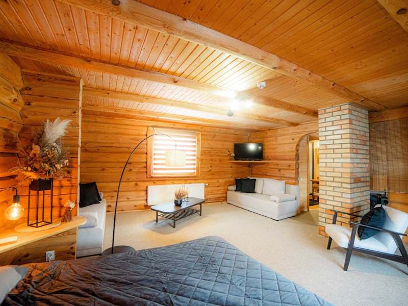 Das Ferienhaus im Viesu nams SAKNĪTES verfügt über ein separates Schlafzimmer, ein gemütliches Wohnzimmer und eine voll ausgestattete Küche mit Kühlschrank und Geschirrspüler. Das Ferienhaus bietet zudem einen Sitzbereich und ein Badezimmer. Kostenloses WLAN ist verfügbar.