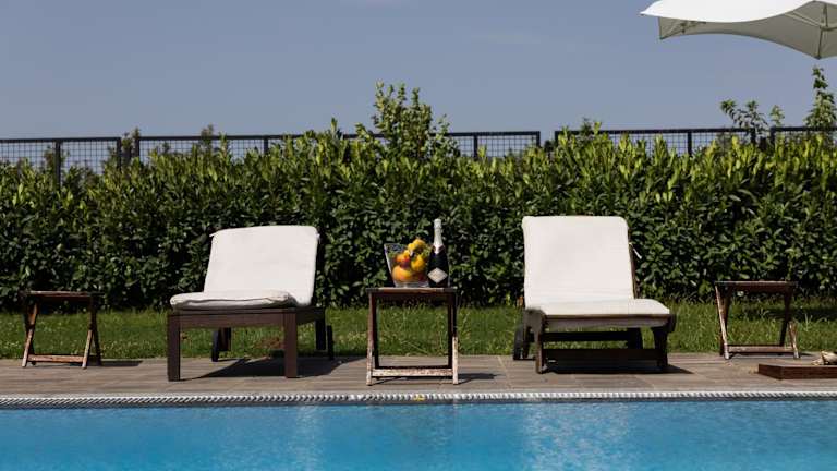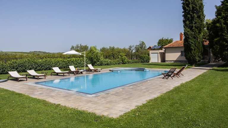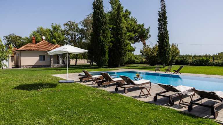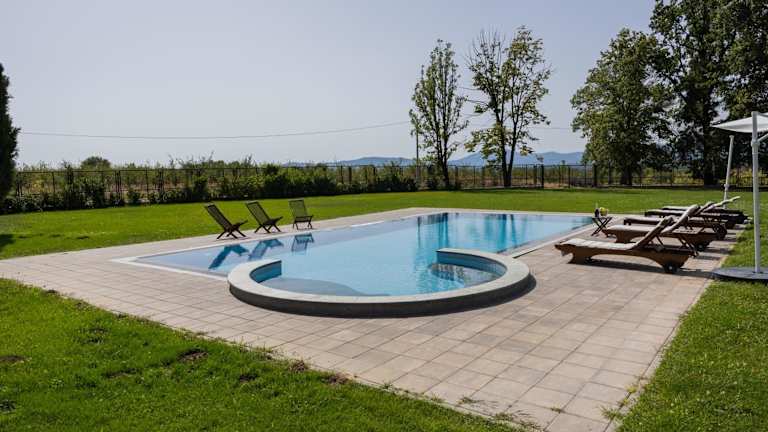 Das Ferienhaus bietet einen Außenpool, der perfekt zum Entspannen und Abkühlen an heißen Tagen ist. Die Terrasse und der Garten laden zum Verweilen ein und bieten einen herrlichen Blick auf die Umgebung. Kostenlose Privatparkplätze stehen ebenfalls zur Verfügung.