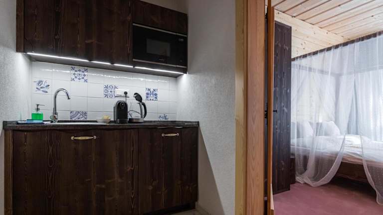 Alle Unterkünfte in der Vila Kotlina - High Tatras 2023 verfügen über einen Flachbild-Sat-TV, ein eigenes Bad und eine voll ausgestattete Küche mit einem Kühlschrank, einer Mikrowelle, einem Kochfeld, einer Kaffeemaschine und einem Wasserkocher.