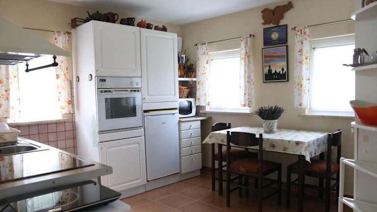 Das klimatisierte Ferienhaus verfügt über ein Schlafzimmer, ein Wohnzimmer und eine voll ausgestattete Küche mit Kühlschrank und Kaffeemaschine. Ein Badezimmer mit Dusche und Haartrockner ist ebenfalls vorhanden. Handtücher und Bettwäsche werden gestellt.