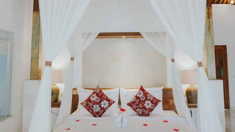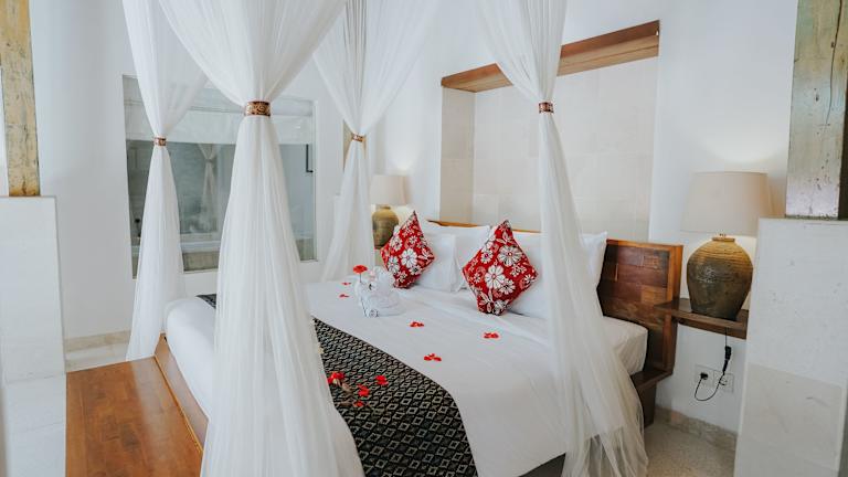 Das Alam Bidadari Seminyak bietet insgesamt 9 Zimmer, die alle geschmackvoll eingerichtet sind und über Annehmlichkeiten wie ein Himmelbett mit Moskitonetzen, einen Sitzbereich mit Sofa, einen Flachbild-Sat-TV und eine Terrasse mit Pool- und Gartenblick verfügen. Die Zimmer sind komplett klimatisiert und bieten ein Badezimmer mit Badewanne und Dusche.