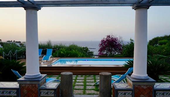 Die Unterkunft verfügt über eine saisonal geöffneten Außenpool, einen Garten und eine Gemeinschaftslounge. Sie bietet kostenloses WLAN und Meerblick. Die Villa ist klimatisiert und umfasst vier Schlafzimmer, ein Wohnzimmer sowie eine voll ausgestattete Küche. Die Unterkunft wird von einem privaten Gastgeber geführt.