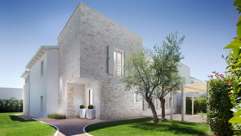 Die Villa Camelia brilliert mit ihrer interessanten Gestalt und der wunderschönen rustikalen Optik, die durch die Kombination aus grober und glatter, weißer Steinoberflächen entsteht. Der Garten wird verziert von gepflegten Rasenflächen und kleinen Pfaden, die die Villa umkreisen und zu zwei überdachten Parkplätzen und einer großen Terrasse mit Swimmingpool, Sonnendeck und einem Speisebereich im Freien führen. Sie ist mit einer hohen Hecke umzäunt, die die Privatsphäre schützt und eine beruhigende Stimmung erzeugt. Das Erdgeschoss der Villa begeistert durch einen offenen Wohnraum mit herausstechenden Details, die an die Wellen des Meeres erinnern: eine wellenförmige Zimmerdecke, eine einzigartige blaue Deckenleuchte und bunte Mosaikverzierungen in der Küche. Die azurblaue Möbelgarnitur sorgt bereits beim ersten Anblick für Wohlempfinden und schafft eine gemütliche Atmosphäre. Im Erdgeschoss der Villa befindet sich zusätzlich ein Abstell- und Waschraum. Die Villa Camelia ist ausgestattet mit 3 Schlafzimmern und 4 Badezimmern und zusätzlichen Bereichen, die zur Aufbewahrung von Kleidung dienen: Begehbare Kleiderschränke befinden sich direkt hinter den Betten. Die Badezimmer sind sehr geräumig; sie können jedoch während der heißen Sommertage ein erfrischendes Duschbad im Freien neben dem Swimmingpool nehmen. Wenn Sie sich mit einem kühlen Getränk im Schatten erfrischen möchten, stehen Ihnen zwei überdachte Terrassen im ersten Stockwerk der Villa, sowie eine Dachterrasse im zweiten Stockwerk zur Verfügung.